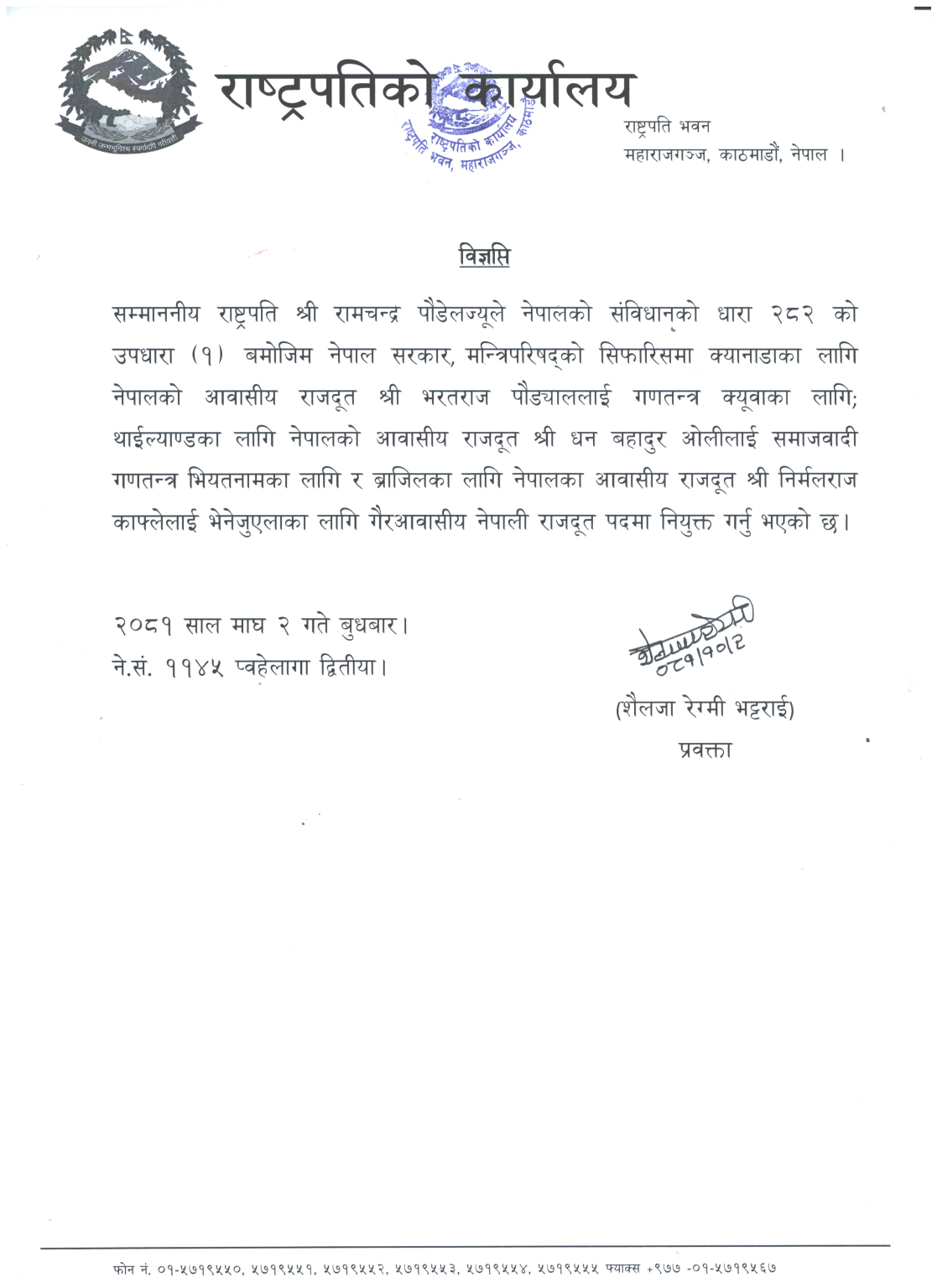 यसैगरी, राष्ट्रपतिले थाइल्याण्डका लागि नेपालका आवासीय राजदूत धनबहादुर ओलीलाई गणतन्त्र भियतनाम र ब्राजिलका लागि नेपालका आवासीय राजदूत निर्मलराज काफ्लेलाई भेनेजुएलाका लागि गैरआवासीय राजदूत नियुक्त गरेको राष्ट्रपतिको कार्यालयले जनाएको छ ।
